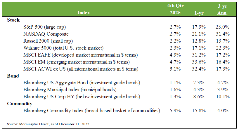 The fourth quarter of 2025 continued to prove resiliency. Despite the longest U.S government shutdown in history, consumer sentiment near record lows, and relentless negative headlines, the upward trend continued. US stocks (large, mid, and small) all advanced more than 2% for the quarter and finished the year near or at all-time highs. In a year with persistent background noise, companies still showed up every day and focused on earning more money. Regardless of the political environment, businesses marched forward, accelerated new technology adoption, channeled capital towards AI, automation, earnings growth, and for the most part, successfully navigated through very choppy seas. A reminder to the general investor population to take a step back, put a halt to panic or worry, and maintain a long-term perspective on all the positive that is still taking place in investment world.