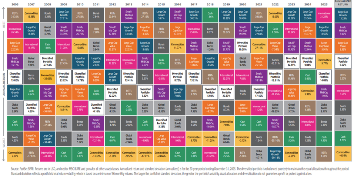 2025 showed us that diversification across various asset classes worked out well and will continue to be key going forward. Below, is popular chart from MFS Fund Distributors, Inc., displaying the best and worst asset classes over the last 20 years. While everyone wants to be in the best performing asset class every year, no one is savvy or wise enough to predict which will come on top. Leadership changes year to year and many could not stomach the wild swings chasing the top performer. This showing the importance of having a diversified portfolio - being a consistent solid performer, while smoothing out the ride along the way.
