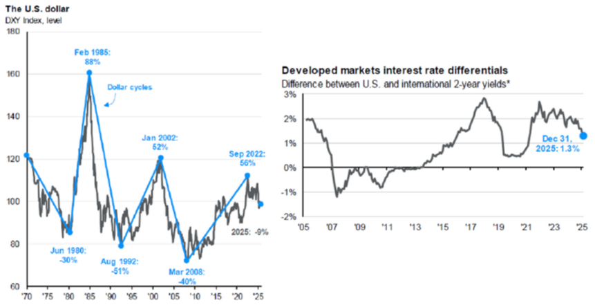 Another driver of the recent decline are interest rates. As U.S. rates have declined over the last couple of years with Fed rate cuts, the interest rate differential between U.S. yields and international yields have dropped, making U.S. fixed income investments less attractive than they have been. The charts below (J.P. Morgan) share this change as well as the long-term cyclical nature of the U.S. dollar.